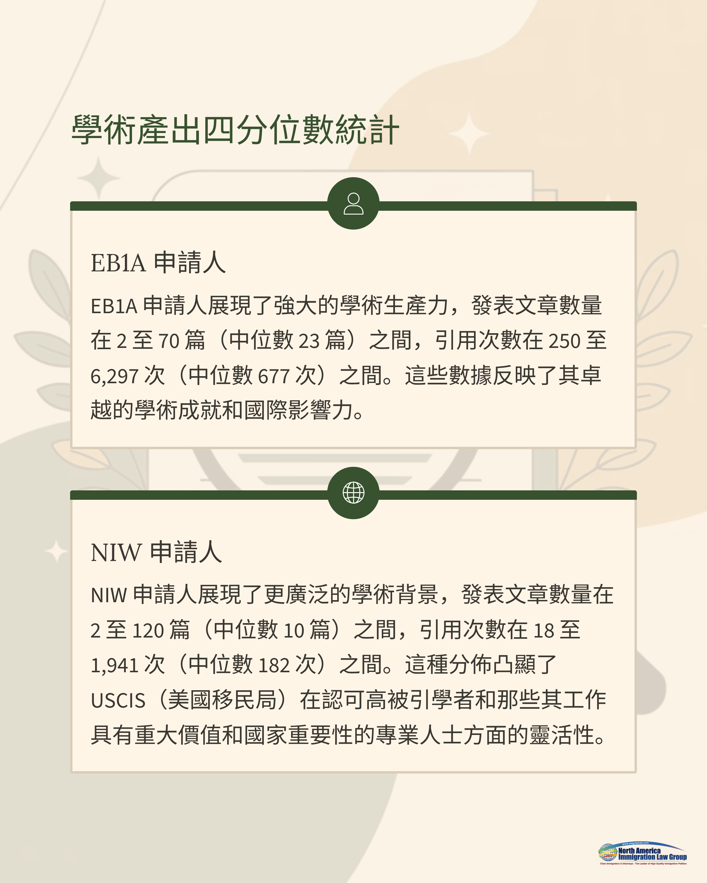 以上數據顯示:EB1A 申請人整體學術產出與國際影響力更為集中且偏高;NIW 分佈更寬,體現 USCIS 對符合國家重要性與實際貢獻價值的多元背景申請人保持開放與包容