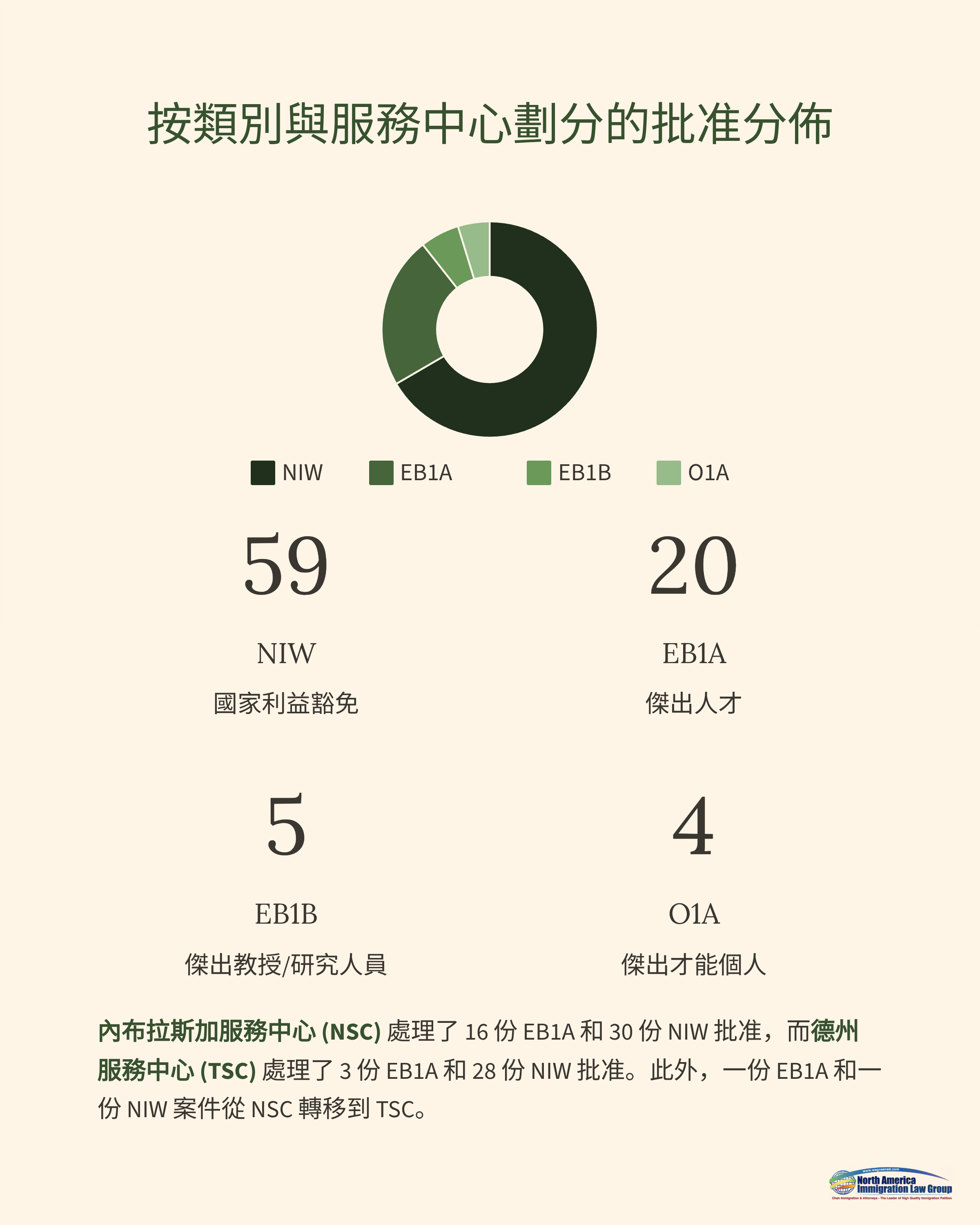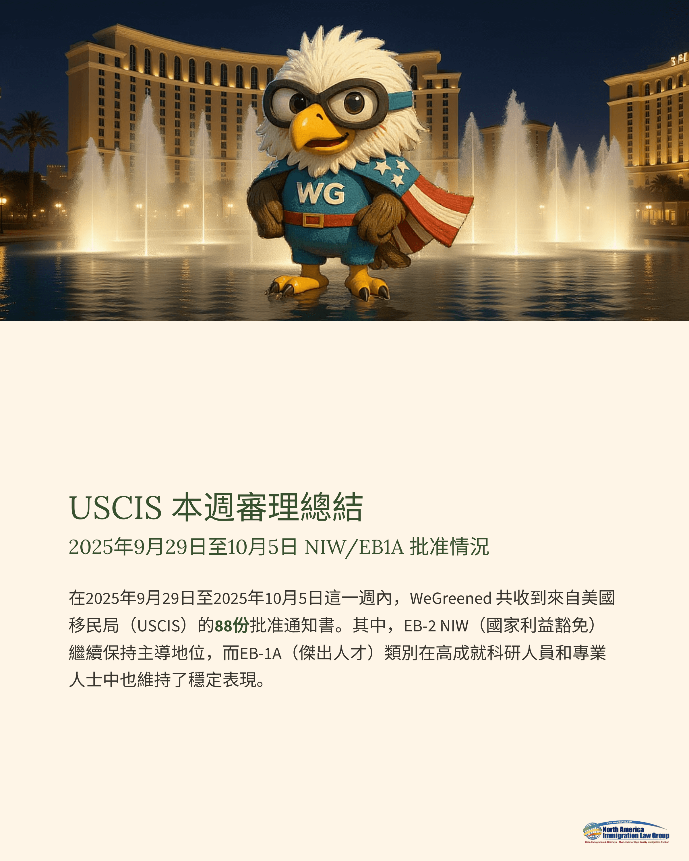 在2025年9月29日至2025年10月5日這一週內,WeGreened 共收到來自美國移民局(USCIS)的88份批准通知書。其中,EB-2 NIW(國家利益豁免)持續居於主導地位,而EB-1A(傑出人才)類別在高成就科研人員與專業人士中亦維持穩定表現。