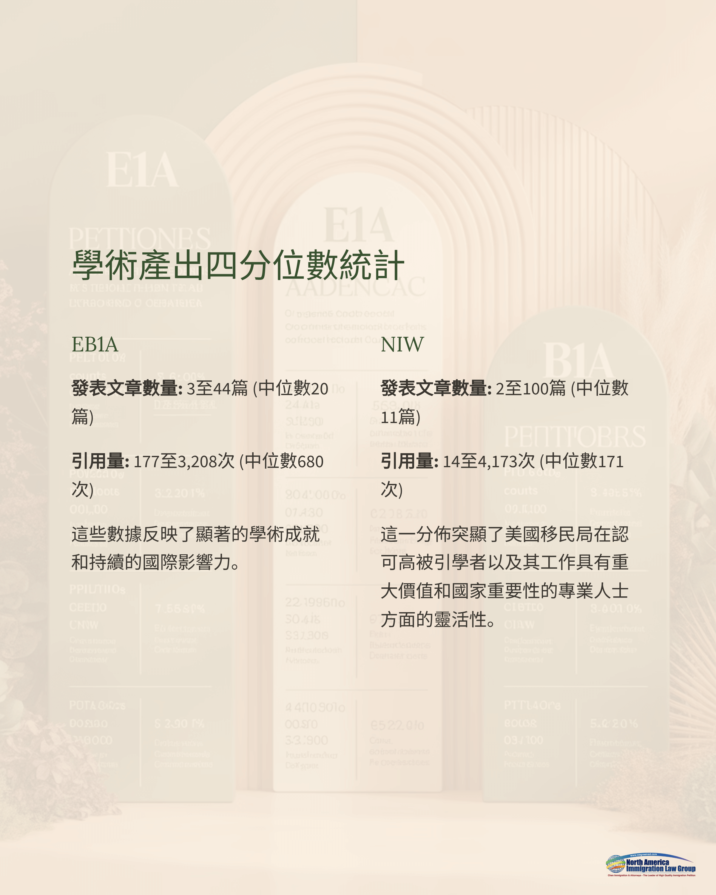 EB1A申請人普遍展現較高的學術產出與國際影響力;NIW則呈現更多元的背景與領域,更著重研究與實務對美國國家利益的直接貢獻。