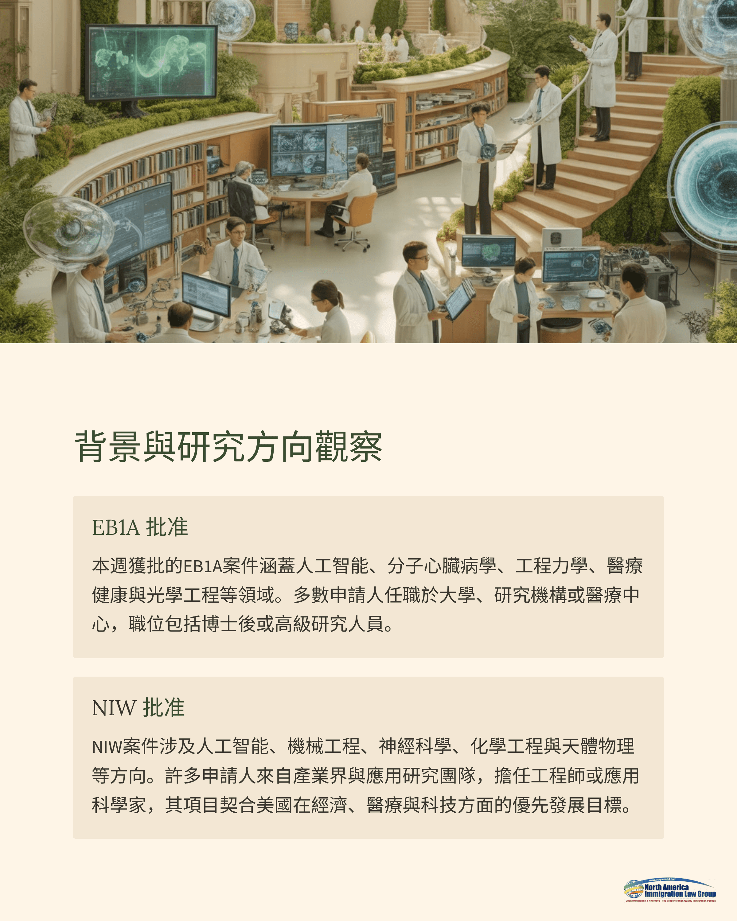 本週獲批的EB1A案件涵蓋人工智慧、分子心臟病學、工程力學、醫療健康與光學工程等領域。多數申請人任職於大學、研究機構或醫療中心,職位包括博士後或高階研究人員。