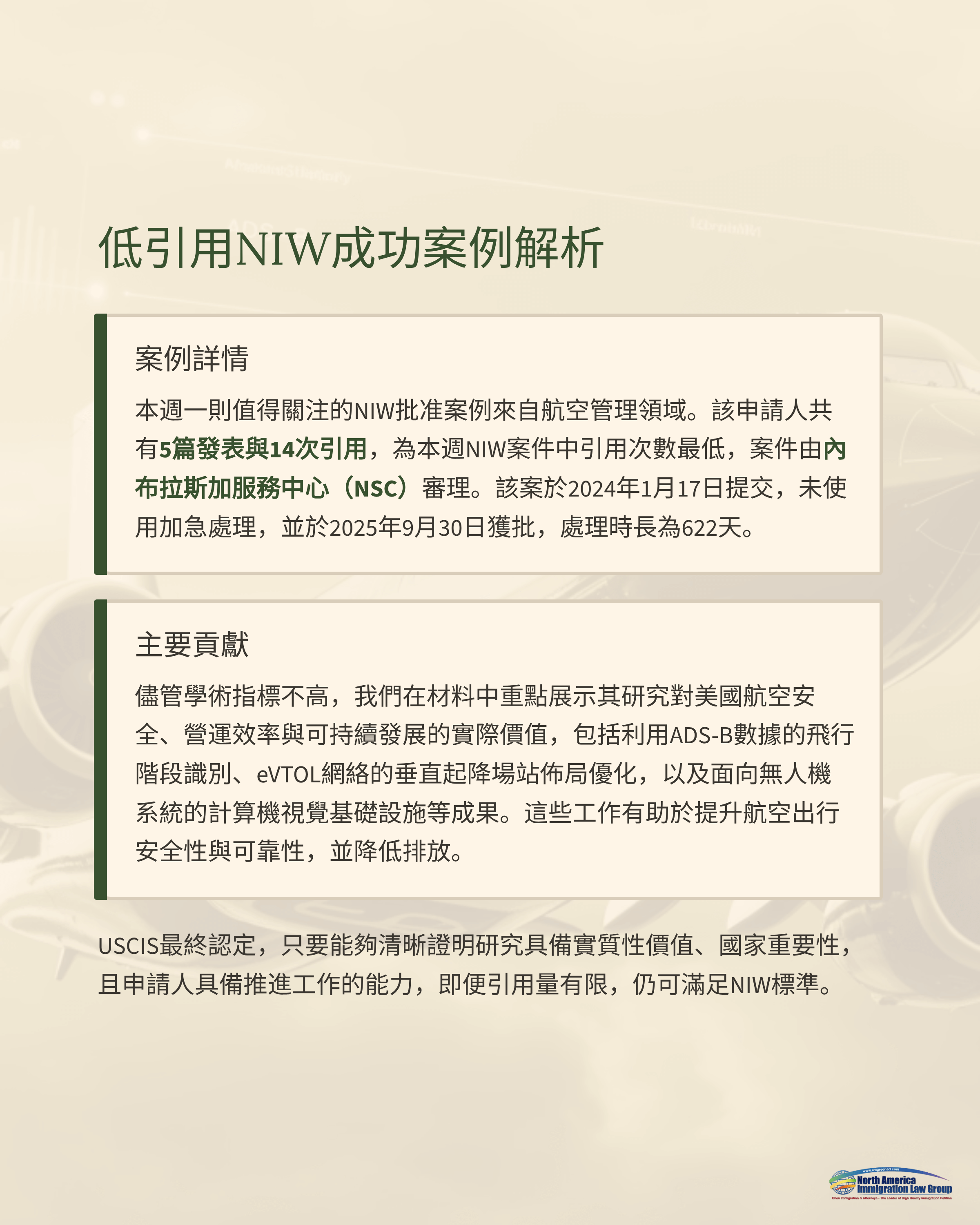 本週一則值得關注的NIW批准案例來自航空管理領域。該申請人共有5篇發表與14次引用,為本週NIW案件中引用數最低,案件由內布拉斯加服務中心(NSC)審理。該案於2024年1月17日送件,未使用加急處理,並於2025年9月30日獲批,處理時長為622天。