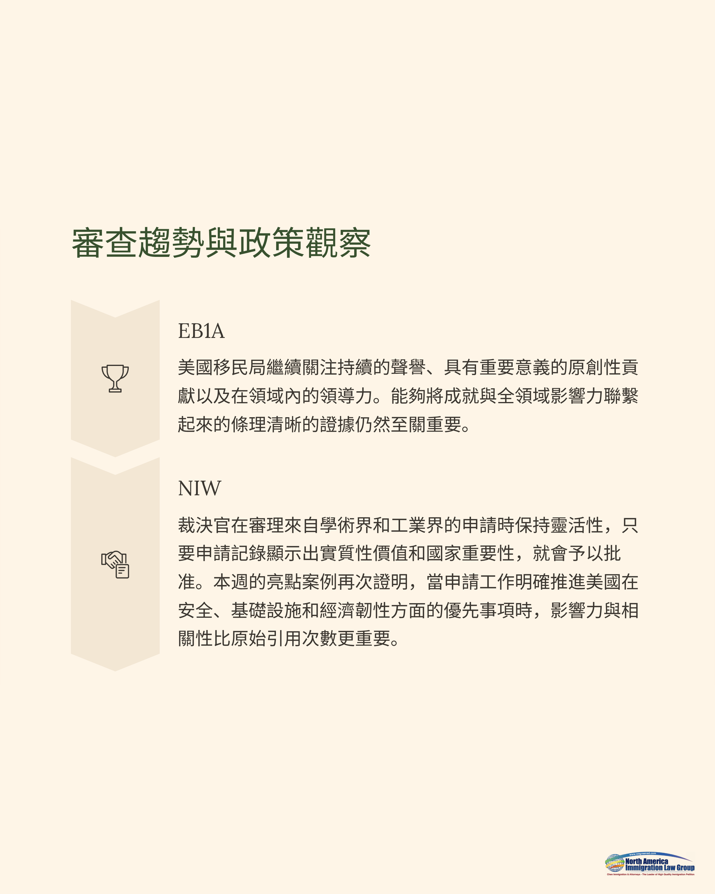 USCIS最終認定,只要能清楚證明研究具有實質價值與國家重要性,且申請人具備推進工作的能力,即便引用量有限,仍可符合NIW標準。
