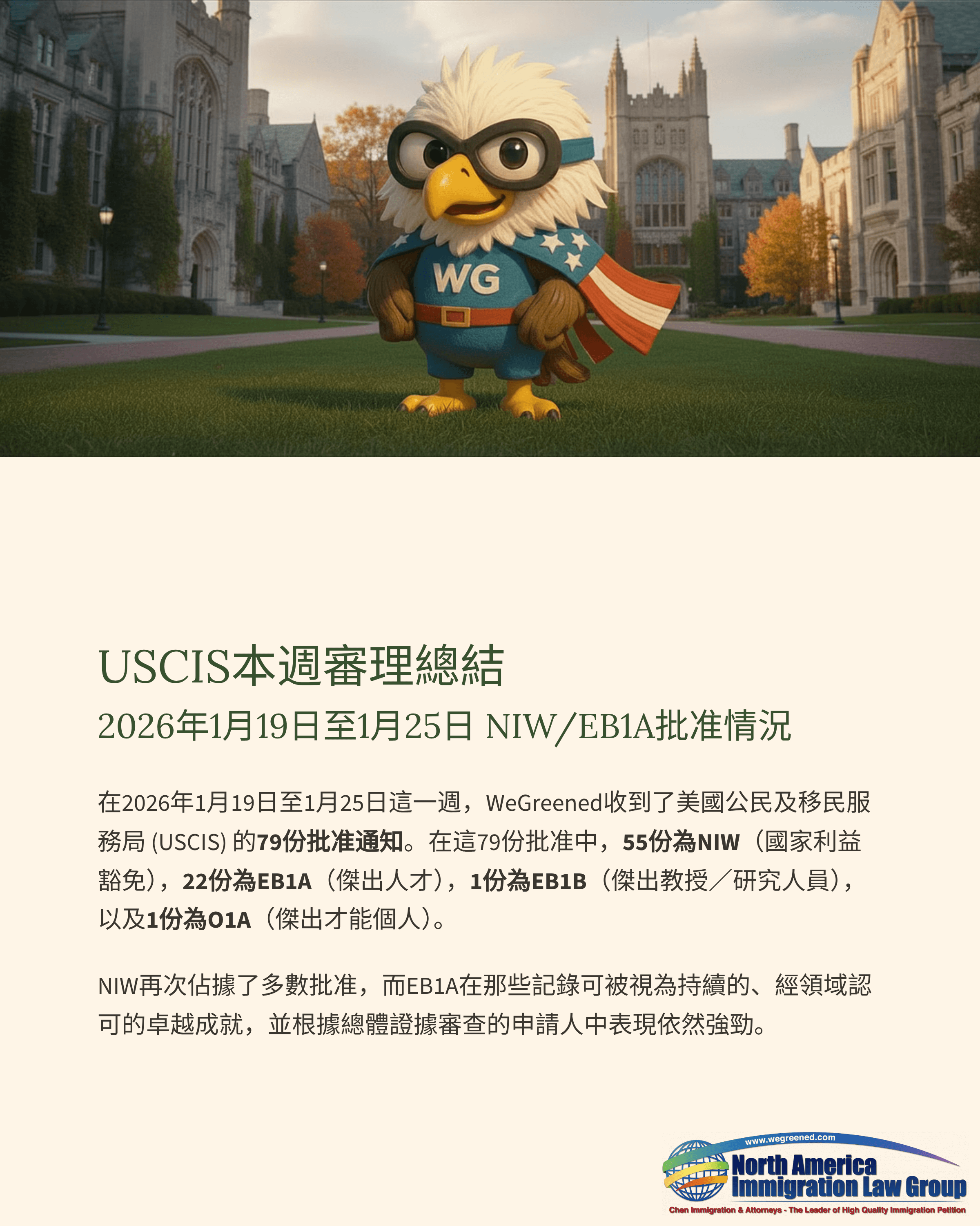 在2026年1月19日至2026年1月25日這一週內,WeGreened 共收到來自美國移民局(USCIS)的79份批准通知書。其中,NIW國家利益豁免)55件、EB1A傑出人才)22件、EB1B(傑出教授/研究人員)1件、O1A(傑出才能個人)1件。