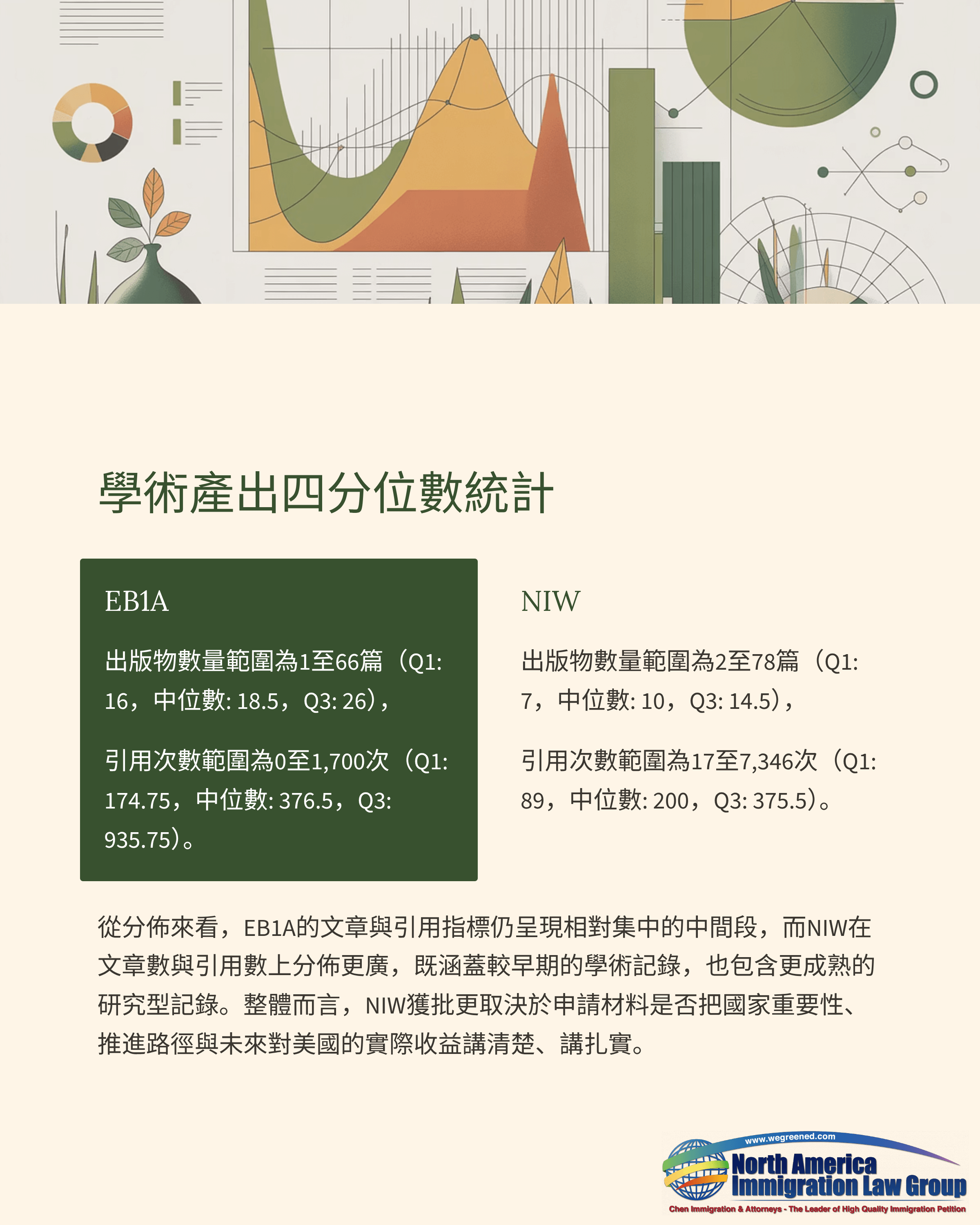 從分布來看,EB1A的文章與引用指標在中間段仍相對集中;NIW在文章數與引用數上分布更寬,既包含較早期的研究紀錄,也包含較成熟的研究型紀錄。整體而言,NIW是否能順利獲批,更取決於材料能否把國家重要性、推進路徑與未來對美國的實際效益講清楚、講扎實。