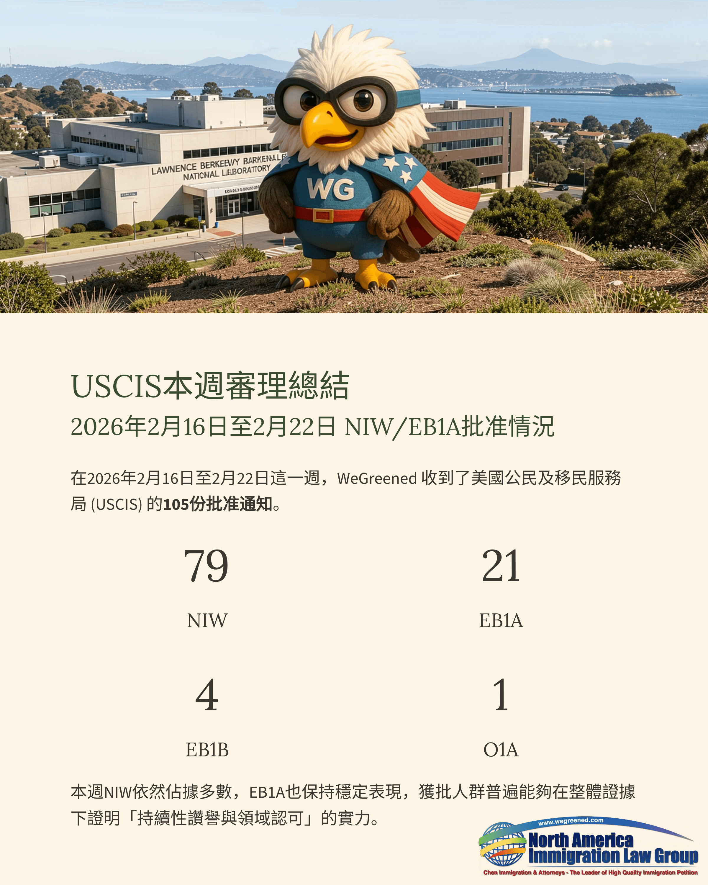 在2026年2月16日至2026年2月22日這一週內,WeGreened 共收到來自美國移民局(USCIS)的105份批准通知書。其中,NIW(國家利益豁免)79件、EB1A(傑出人才)21件、EB1B(傑出教授/研究人員)4件、O1A(傑出才能個人)1件。
