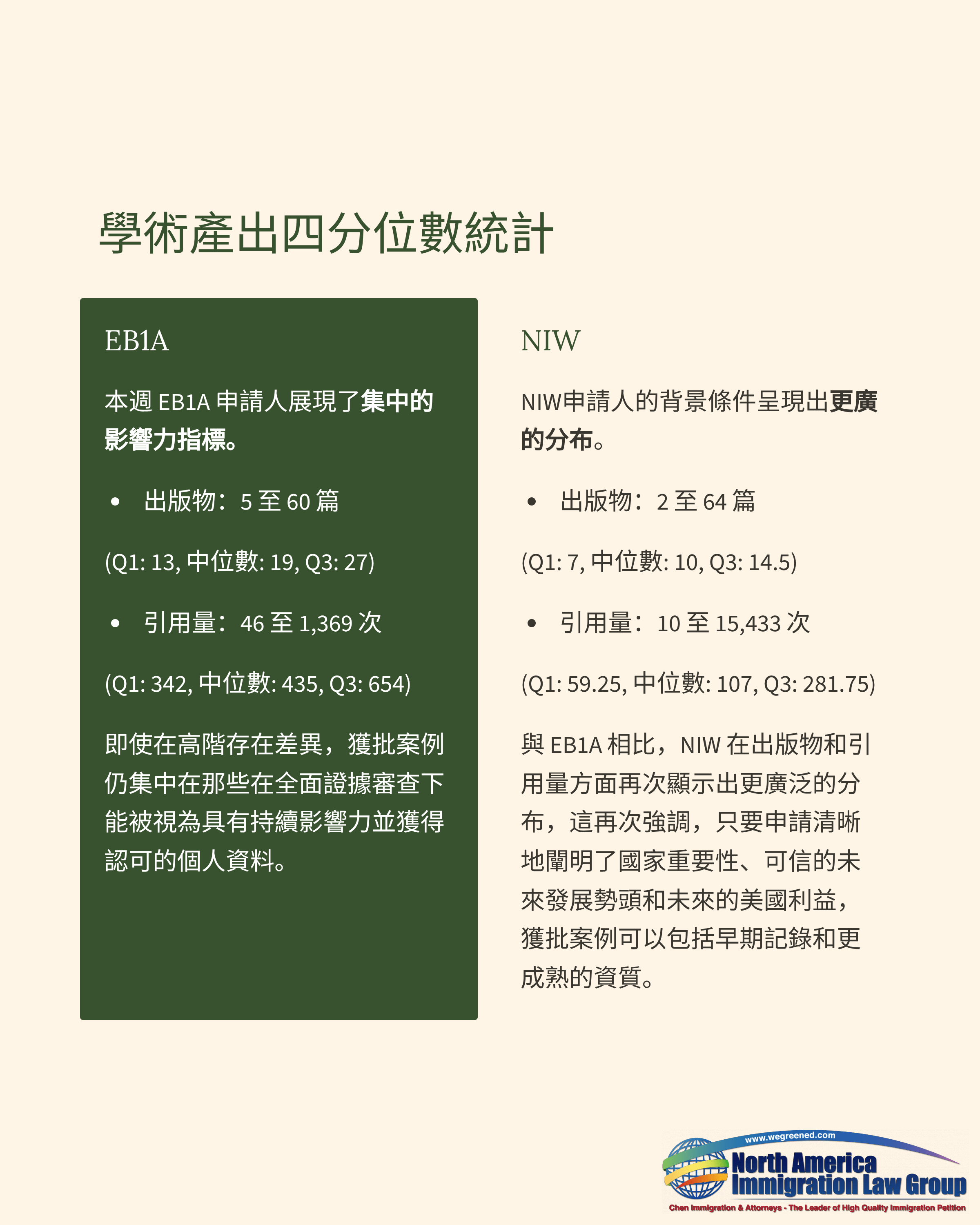 相較EB1A,NIW在論文與引用分布更寬,代表核准樣本既包含較早期的累積,也包含較成熟的研究或產業背景。關鍵仍在於材料是否能把國家重要性、推進路徑與未來對美國的效益說清楚、說扎實。