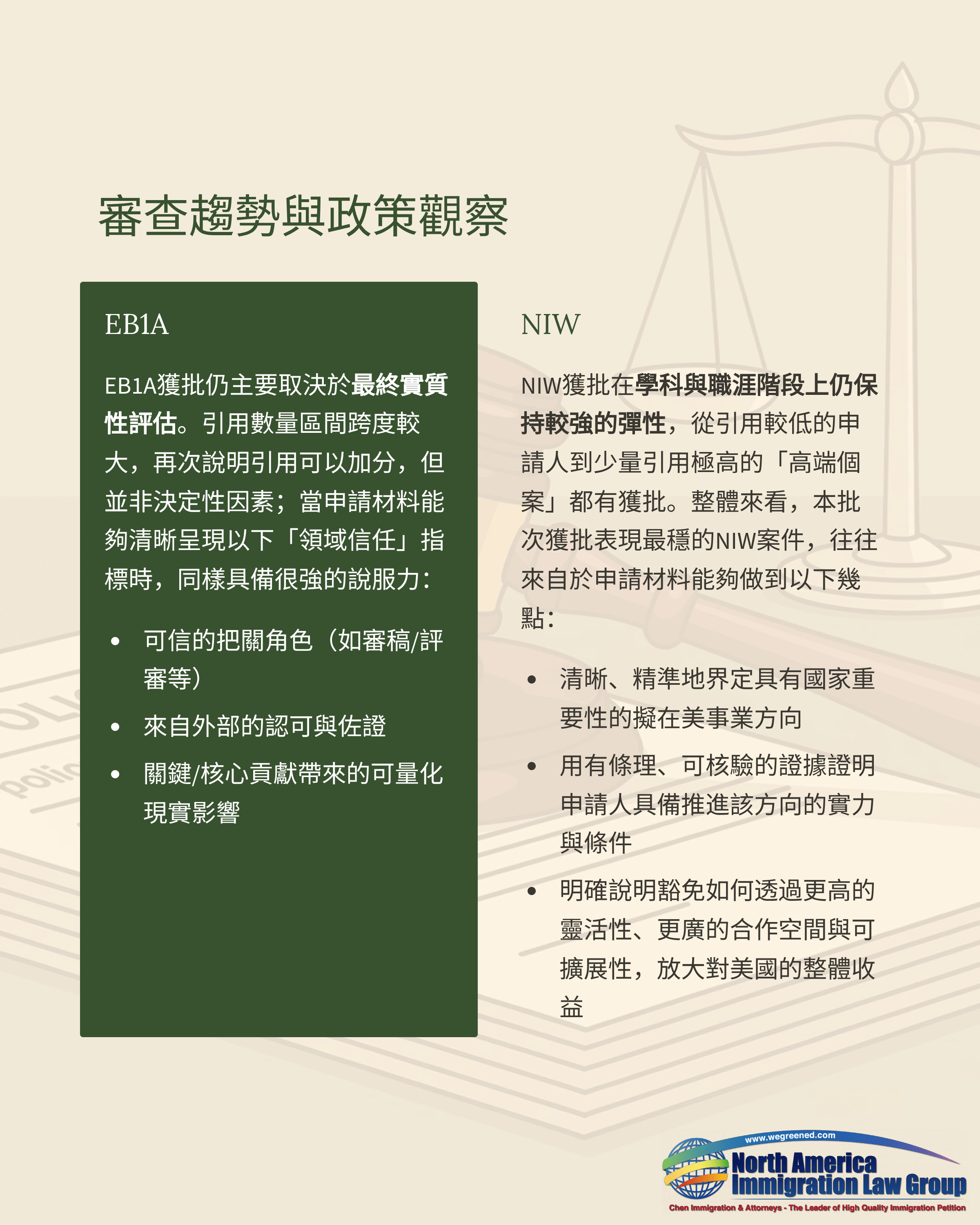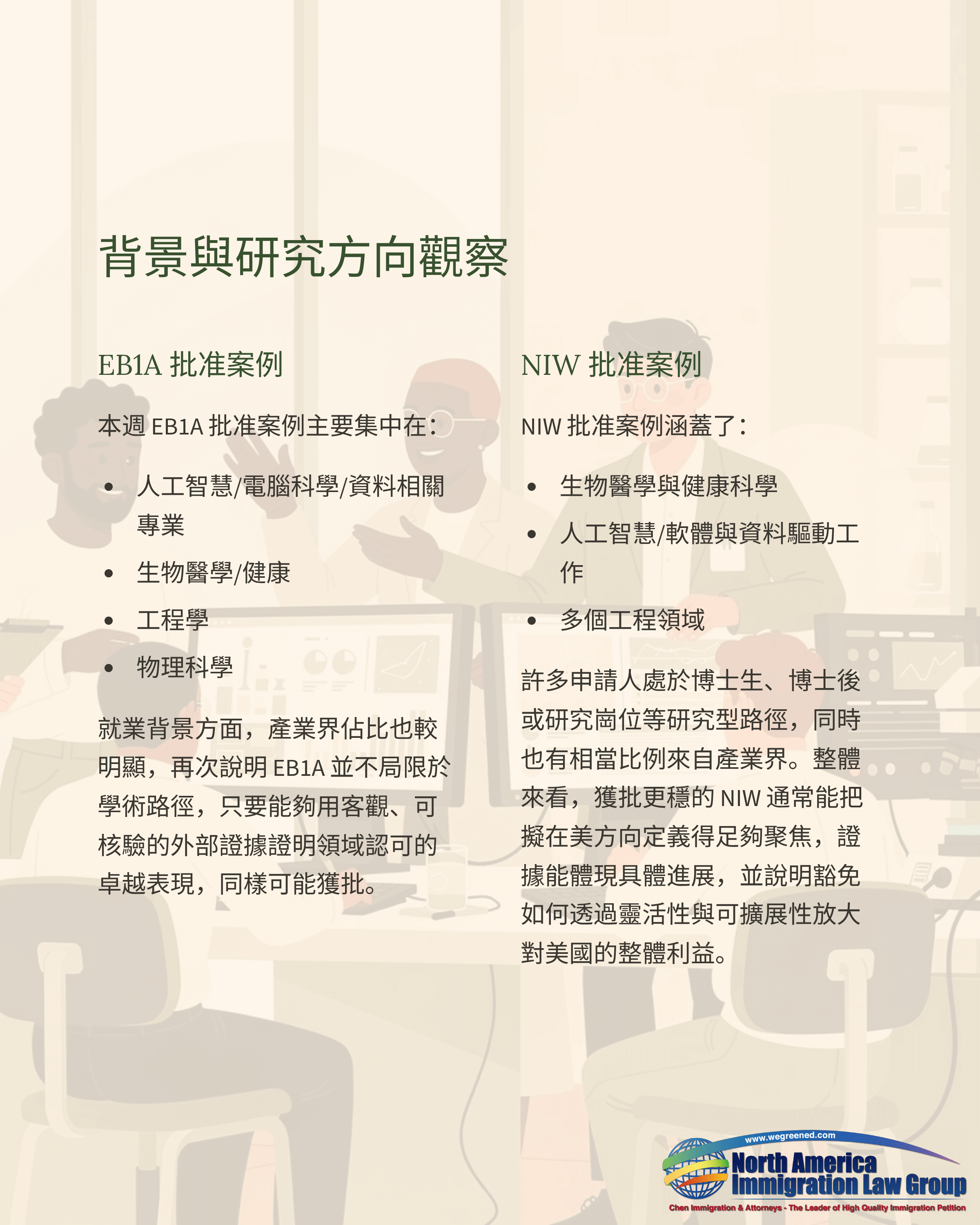 本週NIW仍占多數,EB1A也維持穩定表現,獲批者多能在整體證據下呈現「持續性成就與領域認可」。